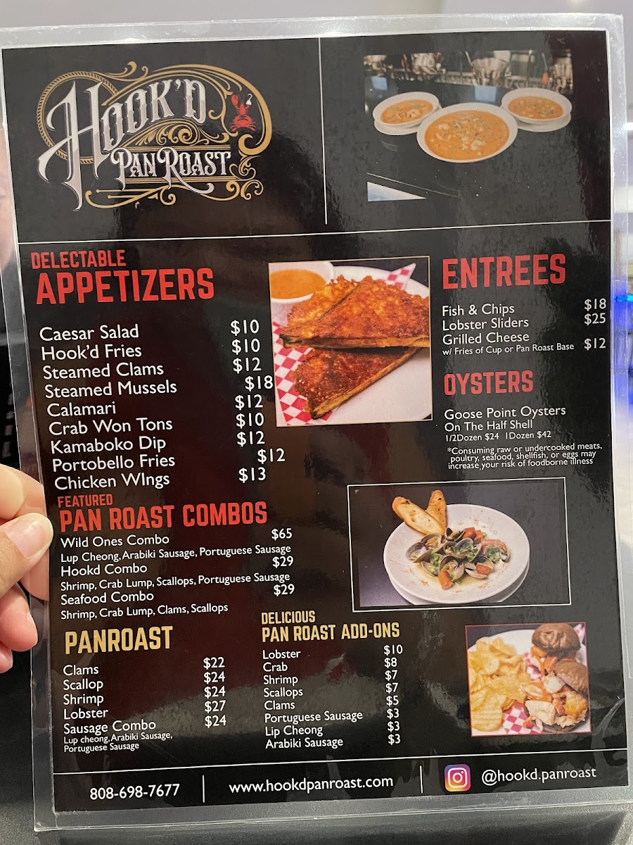 Welcome to Hook'd Pan Roast - Honolulu Seafood Restaurant, a seafood lover's paradise located at 1035 Kapiolani Blvd, Honolulu, HI. This vibrant eatery specializes in mouthwatering pan roasts that blend rich flavors with fresh, local seafood. Highlights include the shareable Wild Ones Combo Pan Roast—a deluxe mix of lobster, shrimp, crab, and more, perfect for indulging with friends or family. For lighter bites, enjoy the crispy Crab Won Tons or the classic Caesar Salad, both crafted with a local touch. Each dish is thoughtfully prepared, from the enticing Hook'd Combo Pan Roast to the flavorful Steamed Clams. Diners appreciate the vibrant atmosphere and the friendly staff, making every visit memorable. Whether it’s a casual dinner or a special occasion, Hook’d Pan Roast promises an unforgettable culinary experience immersed in the sea's finest offerings.